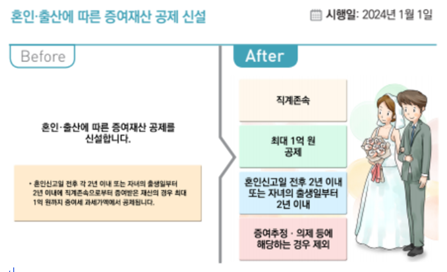 (개선) 기존 5천만 원 공제 한도액 + 혼인이나 출산으로 1억 원 추가 증여세 면제